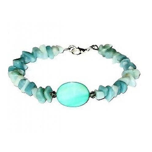 This bracelet features a mint green oval-shaped shell bead accented with Swarovski crystals and Amazonite chip beads. It is made on expandable wire and has a silver-plated lobster clasp. It measures 7 3/4 inches.