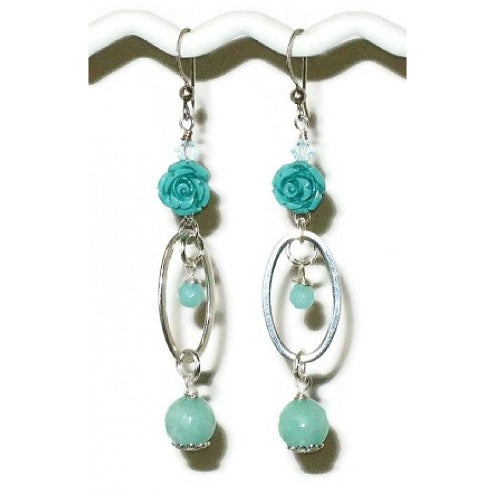 Dress up your outfit with these aqua and mint green earrings. They have semi-precious carved flowers that are linked to sterling silver ovals and adorned with Swarovski crystals, and faceted jade beads. They hang on sterling silver earwires and the total length of the earrings are 2 1/2 inches.