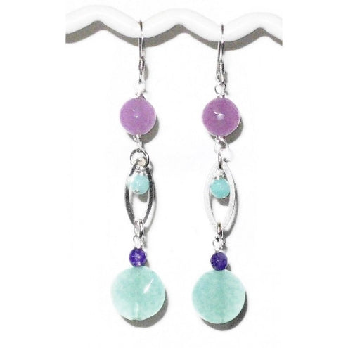 These purple and aqua combination earrings feature a marquise-shaped sterling silver component that is complemented with a faceted coin-shaped chalcedony quartz bead, and faceted jade beads. They hang 2 1/2 inches long, which includes the sterling silver earwires.