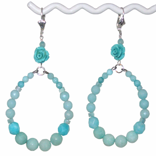 Feel pretty wearing these delicate aqua hoop earrings that will add that extra touch to your outfit. They feature a carved flower bead, that is accented with assorted faceted and smooth jade beads. As well as mother-of-pearl roundel beads. They hang approximately 2 ⅝ inches from the silver-plated leverbacks, and 1 ½ inches across.