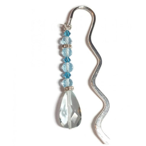 When you are an avid book reader, it is good to have a selection of bookmarks. This one consists of beautiful faceted aqua quartz beads, teal crystals and spacers with rhinestones.
