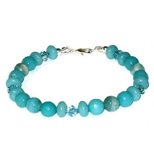 Feel special with this aqua and teal bracelet. It contains faceted jade and agate beads, Swarovski crystals and Czech glass rondells. It has a silver-plated lobster clasp and measures 7 1/2 inches.