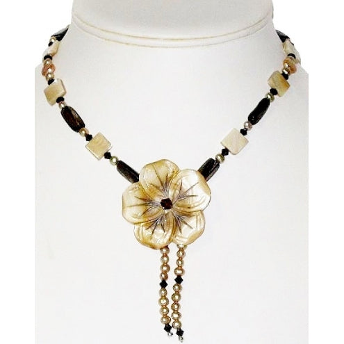 Make a statement wearing this beige and brown necklace that features a shell flower pendant accented with Swarovski crystals, Freshwater pearls and assorted mother-of-pearl beads. It has a silver plated lobster clasp and can be adjusted from 15 - 17 inches using its 1 3/8 inch extender.
