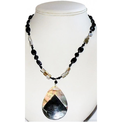 If you need to give a few pieces in your wardrobe some extra style, this black and beige necklace could be great choice for you. It is made with onyx and shell beads and features a mother of pearl black lip shell pendant which has golden beige hues in it. It has a silver-plated lobster clasp and a 2 inch chain extender. So, it can be adjusted from 18 to 21 inches. The pendant hangs 2 3/8 inches from the necklace.