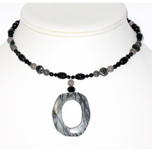This expandable choker features a matrix jasper pendant accented with black onyx, jade, jasper, Swarovski crystals and Czech glass beads.