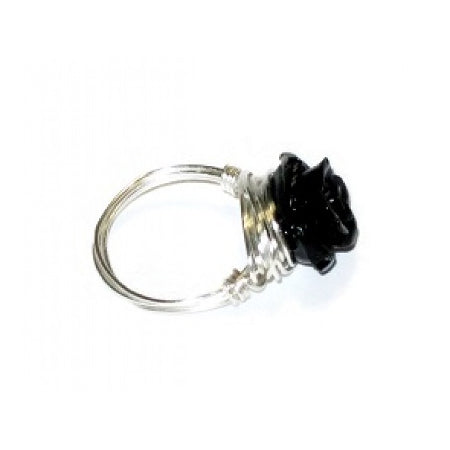 This ring features a carved semi-precious flower that is wrapped in non-tarnish silvertone finish wire.