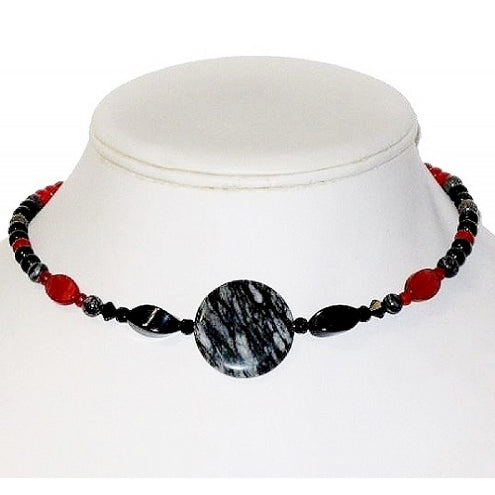 This fashionable expandable choker features a jasper semi-precious stone in the center that is accented with onyx beads, mother-of-pearl, Swarovski crystals, round-shaped jasper beads, magnesite and jade beads.
