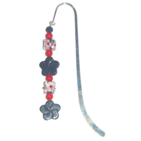 Are you looking for a gift to give to someone who loves to read? Why not give them a handmade bookmark? This bookmark is made up of black flower beads, mother-of-pearl beads, and lampwork glass beads with lovely floral prints.