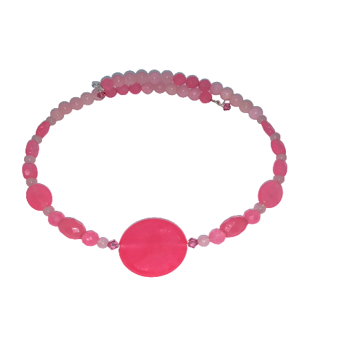 If you are a fan of bright colors, or know someone who is, then this eye-catching expandable hot pink choker, blending into a softer pink, could be the perfect gift for them or for yourself. It is made up of faceted and smooth jade beads and crystals.