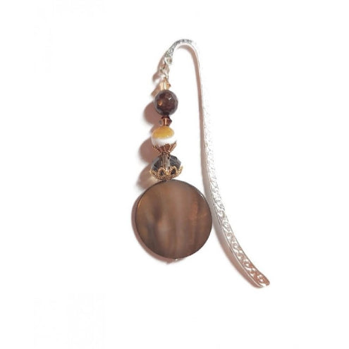 Brown Beaded Bookmark with Coin-Shaped Mother-of-Pearl Bead
