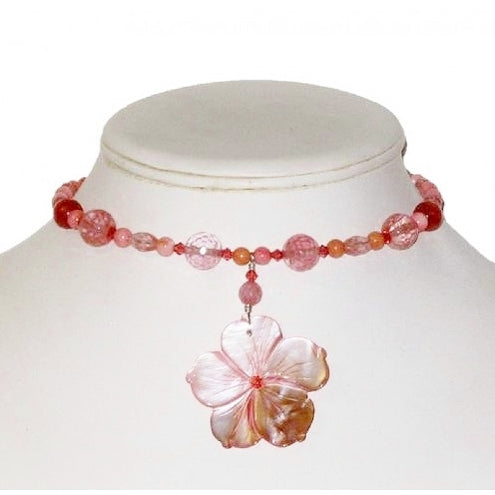 This fancy coral and pink expandable choker features a mother-of-pearl flower pendant which is accentuated with faceted cherry quartz beads, jade, Swarovski crystals and shell beads.