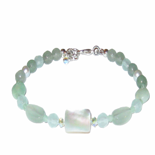 Look stylish in this cream and light green beaded bracelet combination. The cream colored mother of pearl focal piece is highlighted with Swarovski crystals, chalcedony, jade gemstone beads and freshwater peals. It has a silver plated lobster clasp and can be extended from 7 ½ to 8 inches.