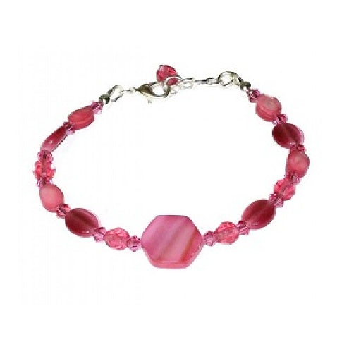 This bracelet consists of a shell center bead accented with faceted mother-of-pearl, Swarovski crystals, fire polished and cats eye beads. It has a silvertone lobster clasp and can be extended from 7 - 7.5 inches.