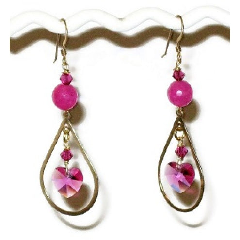 You can pair these earrings with your favorite gold chain to add a pop of color. They feature a heart-shaped Swarovski crystals that hangs from teardrop 14k gold-filled hoop components, which are accented with faceted jade beads. Including the 14k gold-filled earwires, they measure approximately 2 3/8 inches