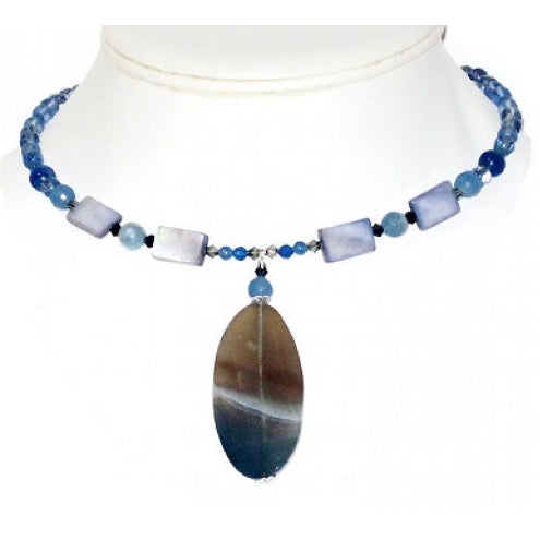 Make this choker the focal of your look. It features a faceted sardonyx agate pendant that hangs approximately 2 1/2 inches from choker and measures 1 inch across. It is accented with Gray and Dark Blue Swarovski crystals, faceted jade, blueberry quartz and mother-of-pearl beads. It is made on expandable wire to adjust comfortably on your neck.