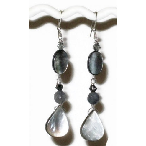 The expandable choker consists of iridescent black lip shell teardrop beads in the center which are accented with Swarovski crystals , mother-of-pearl beads and faceted jade beads. The matching earrings measure approximately 2 1/2 inches, which include the silver-plated earwires.