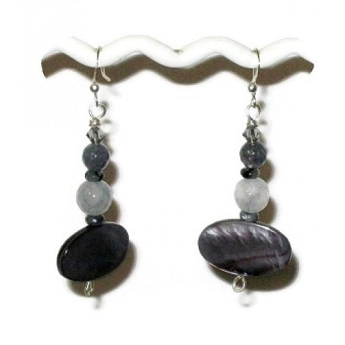 If you are looking for jewelry pieces in neutral colors that will match several of your outfits , this neutral-colored bracelet set will be perfect for you. It is made up of jade, black lip shell, zebra jasper, and mother-of-pearl beads. The bracelet is 7-1/2 inches and the matching earrings are 2 inches long with their silvertone earwires.