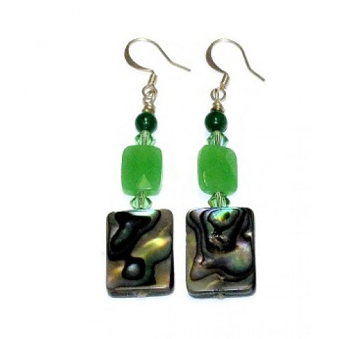 This comfortable choker is expandable and comes with matching earrings that are 2-1/4 inches with their silvertone earwires. This choker set consists of seed beads, Swarovski crystals, and a range of beautiful semi-precious beads such as jade, freshwater pearls and abalone shell. The abalone beads have different lovely hues especial when light hits them.