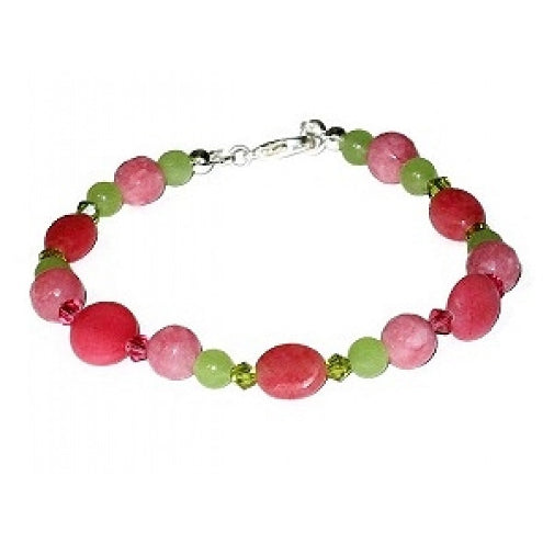 You will enjoy wearing this colorful bracelet with different wardrobe pieces. It consist of assorted faceted and smooth jade beads, along with Swarovski crystals. It measures 7 1/2 inches, which includes the silver-plated lobster clasp.