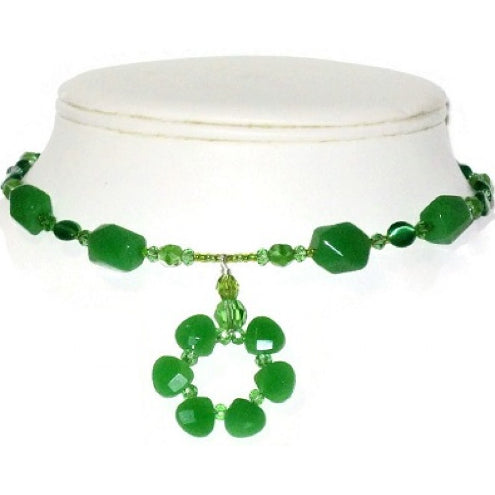 This delicate green expandable choker can make you or someone else feel special. It features a open flower pendant accented with faceted jade beads, Swarovski crystals, cats eye beads, and Czech glass beads.
