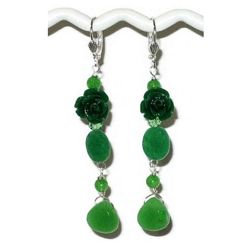 These earrings are a beautiful vibrant green color, yet very delicate. They feature semi-precious carved flowers that are accented with faceted quartz briolettes, Swarovski crystals and faceted and smooth jade beads. They measure 2 1/2 inches long, which include the silver-plated leverbacks.