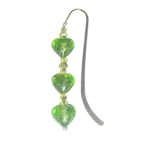This bookmark consists of heart-shaped foil glass beads and faceted glass beads. The beads in this bookmark also have small splashes of goldtones and red tones and the hook is goldtone.