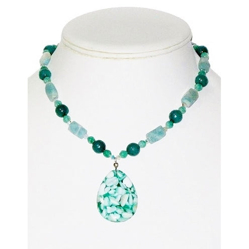 Green Jade and Amazonite Necklace with Mosaic Mother-of-Pearl Pendant