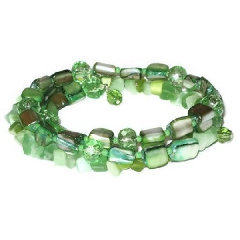 This expandable bracelet is made up of shell beads, glass beads, chip beads, and seed beads.