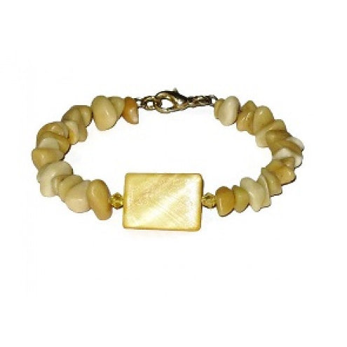 Feel confident in this yellow bracelet with a shell center, Swarovski crystals and jade chip beads. It is made on expandable wire, has a gold-plated lobster clasp and measures 6 3/4 inches.