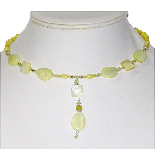 This light shade of yellow is popular this season. This choker was made on expandable wire which allows it to fit comfortably on your neck. It consists of both faceted and smooth mother-of-pearl beads and Swarovski crystals. The fancy drop pendant hangs 2 1/2 inches from the choker.
