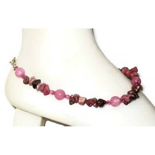 This mauve and rose-colored anklet is made up of Swarovski crystals,Rhodinite Chip beads and jade beads. It is ended with a silver-plated lobster clasp and measures 10 inches.