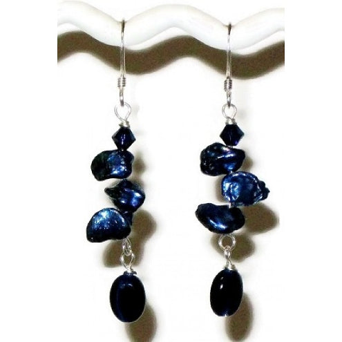 These elegant earrings consist of keshi pearls, Swarovski crystals and cats eye beads. They contain silver-plated earwires, and the entire length of the earrings is 1 7/8 inches.
