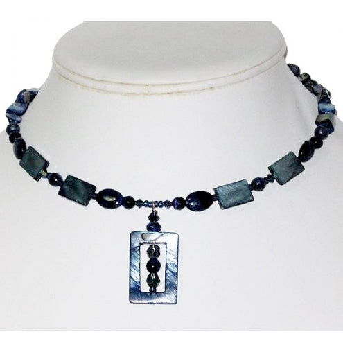 Have you been searching for navy blue jewelry? This expandable choker just may be perfect for you. It features a rectangle-shaped shell drop pendant accented with faceted and smooth glass beads, assorted mother-of-pearl beads and Swarovski crystals.