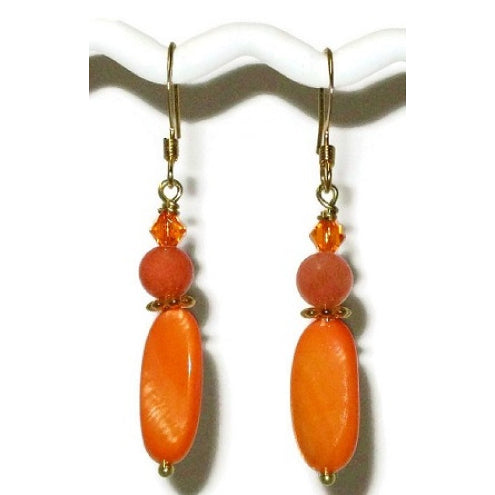 These drop earrings are in a vibrant shade of orange that can give a nice accent to your outfit without over powering it. They measure 1 7/8 inches starting from the top of the gold-plated earwires. It also contains goldtone daisy components, Swarovski crystals, mother-of-pearl and jade beads.