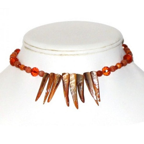 This expandable choker consists of mother-of-pearl, crystals, and assorted faceted jade beads. It is very comfortable and will add a great pop of color to your outfit.