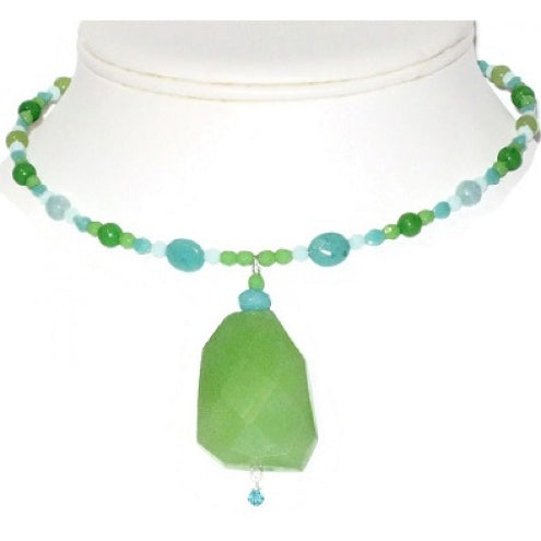 This expandable choker can be that perfect piece that will bring your outfit to the next level. It features a faceted jade pendent which is accented with a Swarovski crystal that hangs down approximately 2 1/4 inches. The choker is accented with faceted and smooth jade beads, Czech glass and amazonite beads.