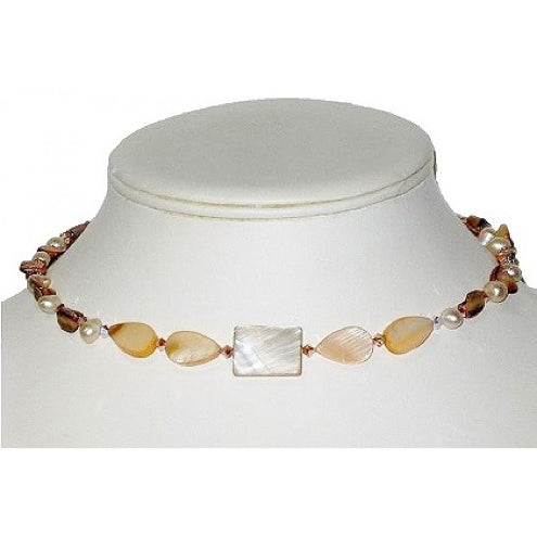 This peach and cream choker is made on expandable wire and is accented with dancing freshwater pearls, Swarovski crystals and mother-of-pearl shell beads.