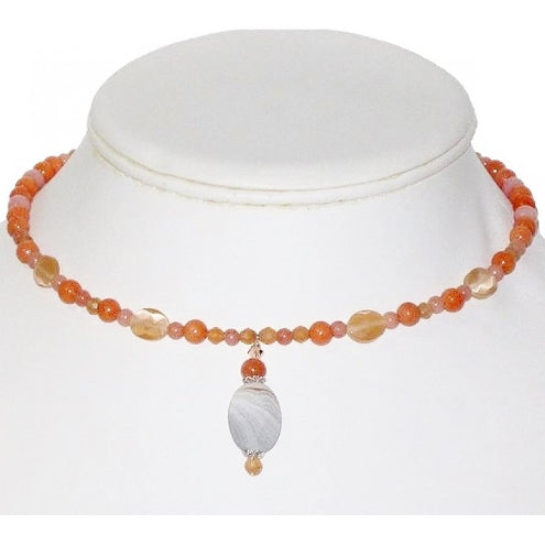 This expandable choker is great way to add a subtle touch of style to your look. It is very delicate, and features a faceted agate pendant which is accented with a Swarovski crystal, faceted and smooth round jade beads, as well as faceted oval-shaped cats eye beads.