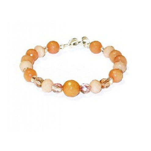 This bracelet is made on expandable wire to allow for a comfortable fit. It has a blend of light and dark peach faceted jade and czech glass beads, as well as Swarovski crystals. It has a silver-plated lobster clasp.