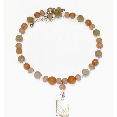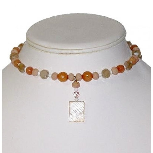 This expandable choker contains a blend of peach, salmon, off-white and peachy beige-colored beads. It is made up of faceted jade and glass beads that complement the 1 5/8 inch long drop pendant. The pendant features a rectangle-shaped shell bead. It has a silver-plated lobster clasp, and a 2 3/4 inch chain extender.