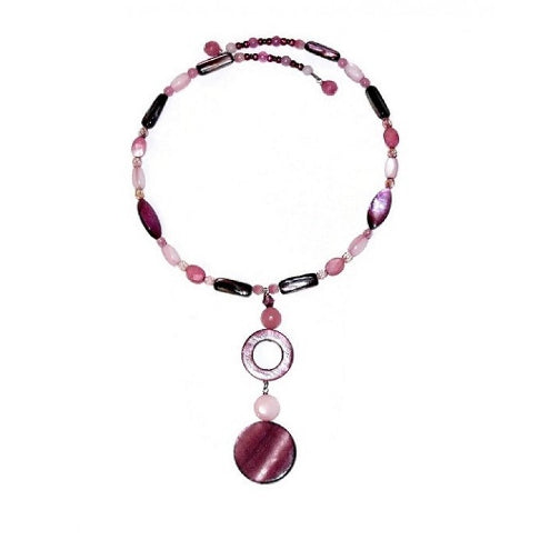 This expandable choker has hues of plum, burgundy and pink.  It features a 2 5/8 inch long drop pendant which is accentuated with mother of pearl beads, Swarovski crystals faceted and smooth jade Beads.