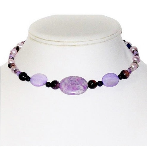 This choker has a lovely array of shades of purple. If purple is one of your favorite colors, this choker just might be the perfect one for you. It is made up of crazy lace, mother-of-pearl, jade, sardonyx and freshwater pearl beads and measures 15 inches with its silvertone lobster claw clasp.