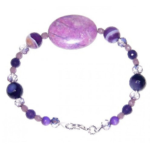 Do you love the color purple and have a hard time finding purple jewelry pieces to match your outfits? Perhaps, this bracelet set is just for you. It is made up of lovely crazy lace beads, sardonyx, mother-of-pearl and faceted glass beads, and it measures 7-1/2 inches with its silvertone lobster claw clasp. The matching earrings are 3-1/4 inches with their silvertone earwires.