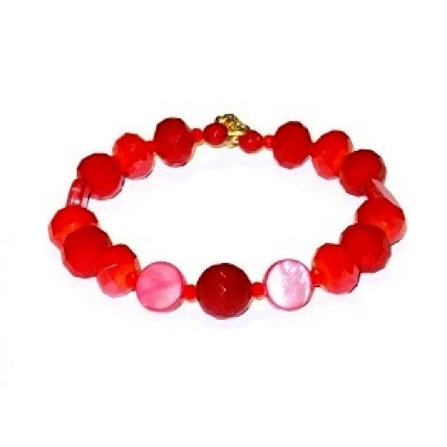 This red bracelet consists of mother-of-pearl beads, crystals and a faceted jade bead in the center. It is made on expandable wire, and has a gold-plated lobster clasp. The size of this bracelet is 7.