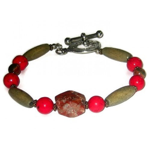 Beaded bracelets are a very popular part of men's fashion today. This bracelet is 8-3/4 inches with its cool silvertone clock toggle clasp, an it consists of wood, jasper, antique brass and magnesite beads.