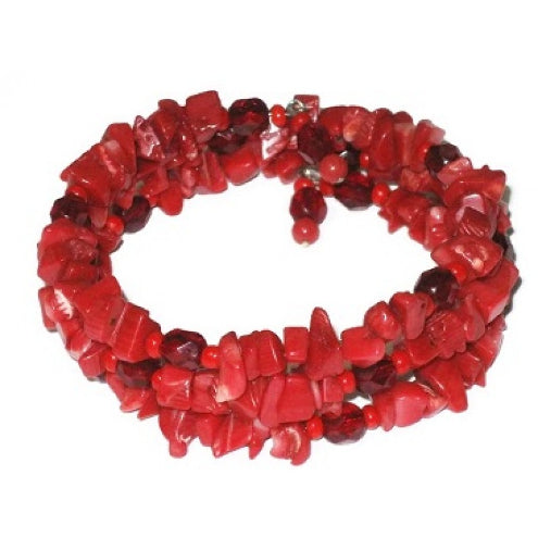 This expandable bracelet consists of red coral chip beads and faceted glass beads.