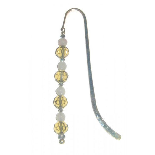 This bookmark consists of a silvertone hook, rose quartz beads (which look more like a milky white color than pink), Swarovski crystals and gray/champagne faceted glass beads. Why not add it to your collection of bookmarks in your home library?