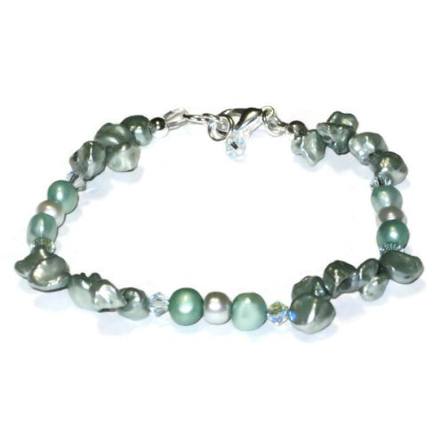 This elegant sage and mint green bracelet contains freshwater pearls, Swarovski crystals and keshi pearls. It is finished with a silver-plated lobster clasp and can be extended from 7 1/4 to 7 1/2 inches with its chain extender.