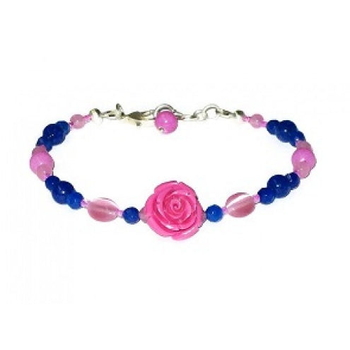 Feel special in this unique sapphire and pink beaded bracelet with a delicate semi-precious hot pink carved rose flower. Consisting of faceted and smooth jade beads and cats eye beads. It has a silver-plated lobster clasp and can be extended to 7 1/4 inches when using the extender.