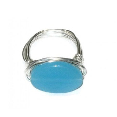 This ring is size 6 1/2 and consists of an oval-shaped chalcedony bead wrapped with non-tarnish silvertone wire.